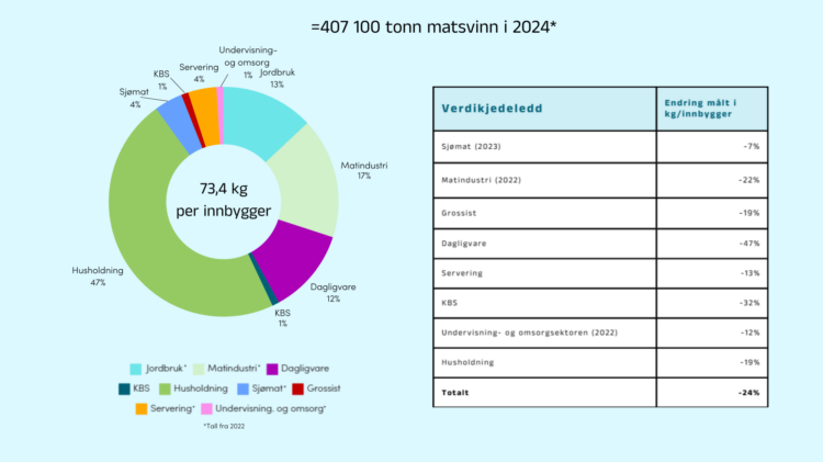 Det kartlagte matsvinnet i Norge utgjorde totalt 407 100 tonn i 2024, hvilket tilsvarer 73,4 kg matsvinn per innbygger og år. Mest matsvinn oppstår på husholdningsleddet, i jordbruket og matindustrien. Fra 2015 til 2024 er det estimert at matsvinnet er redusert med 24 prosent, målt i kg/innbygger. Jordbruk er ikke inkludert i dette tallet. Den største nedgangen i matsvinnet de siste årene har skjedd hos dagligvarekjedene, i matindustrien og blant husholdningene.